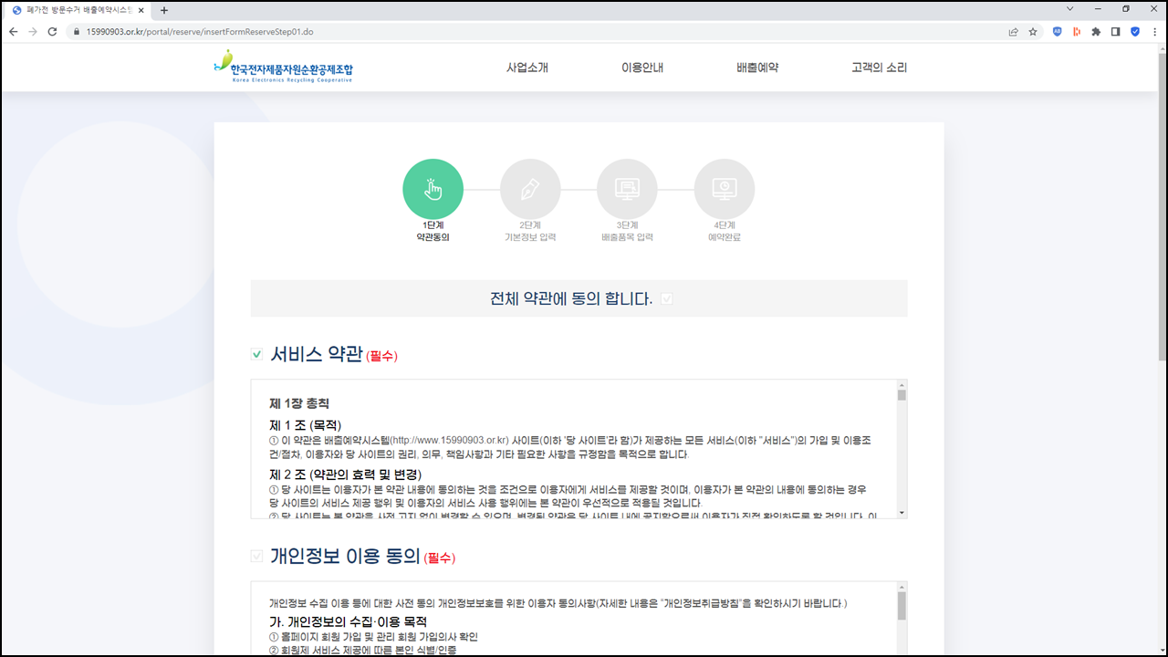 접수는 수거예약하기를 클릭하여 신청서를 작성할 수 있습니다.